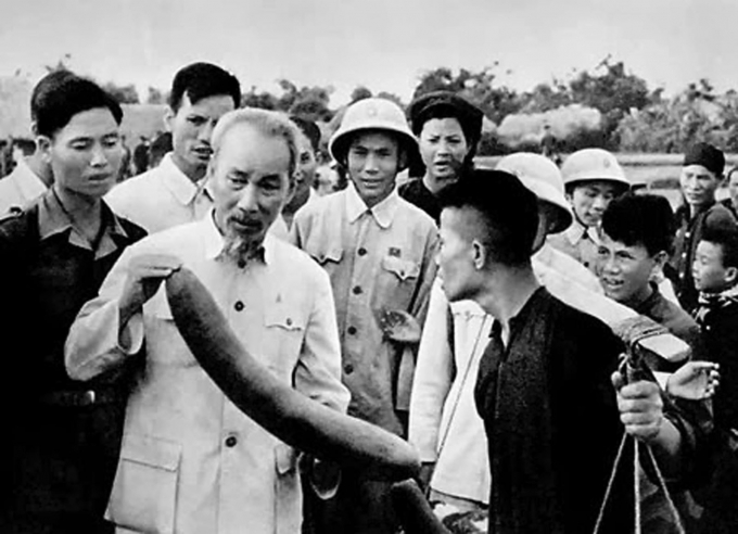 | Bác Hồ thăm, tìm hiểu thực tế sản xuất của nông dân xã Ái Quốc (Hải Hưng) năm 1958. Ảnh tư liệu |