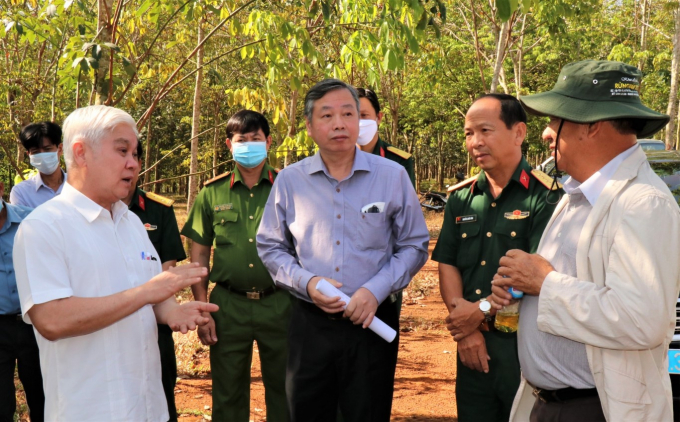Bí thư Tỉnh ủy Nguyễn Văn Lợi trao đổi cùng đoàn khảo sát và nguyên Bí thư Tỉnh ủy Nguyễn Tấn Hưng tại hiện trường sân bay Técníc Hớn Quản.