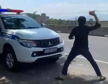 Nhặt thanh long bên đường ném liên tiếp vào xe cảnh sát giao thông.