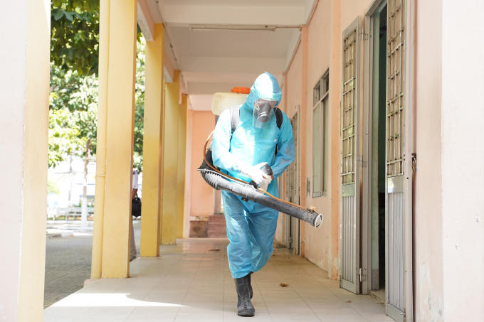 Nhân viên y tế tiến hành phun thuốc khử khuẩn tại các trường học.