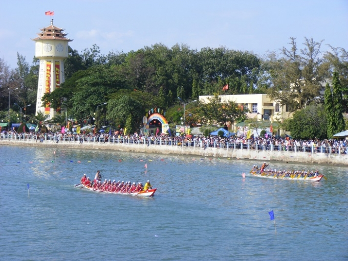 | Hàng ngàn người đã đổ về dọc hai bên bờ sông Cà Ty (Phan Thiết, Bình Thuận) để theo dõi Lễ hội đua thuyền. |