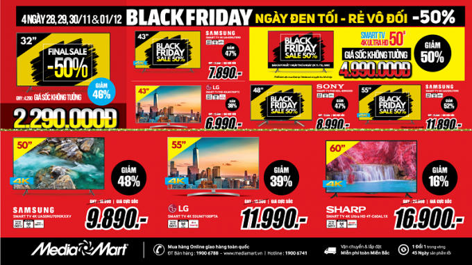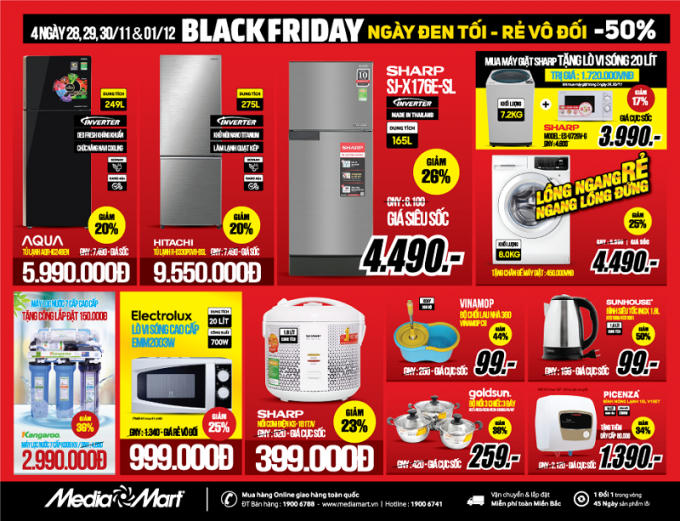 Dịp Black Friday, hệ thống siêu thị điện máy MediaMart mang đến chương trình “Ngày đen tối - Rẻ vô đối” với Smart TV 50inch giá chi 4,99 triệu, máy giặt Sharp 7.2kg giá sốc 3,99 triệu tặng lò vi sóng, tủ lạnh Sharp 165l chỉ 4,49 triệu cùng hàng nghìn sản phẩm giảm giá tới 50%. Chương trình áp dụng duy nhất trong 4 ngày vàng từ 28/11-1/12/2019.