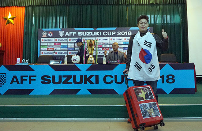 Lee Jae Hyung gây chú ý với lá cờ Hàn Quốc trên người cùng với chiếc vali dán đầy hình ảnh của HLV Park Hang Seo mà anh kéo theo vào phòng họp báo. Theo tìm hiểu, Lee Jae Hyung chính là bình luận viên đã bình luận trực tiếp tất cả các trận đấu của ĐT Việt Nam ở AFF Cup 2018 kể từ đầu giải.
