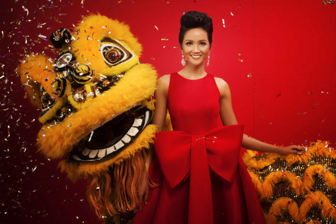 Trong sắc đỏ rực rỡ đậm chất mùa xuân, Hoa hậu H’hen Niê, Á hậu Hoàng Thùy và Á hậu Mâu Thủy nổi bật khoe dáng bên cạnh những chú lân – biểu tượng may mắn của ngày Tết. Với thiết kế đầy tinh tế và thanh lịch của Đỗ Mạnh Cường, Top 3 Hoa hậu Hoàn vũ Việt Nam mỗi người một vẻ, tươi tắn nở nụ cười, mang lại một năm mới nhiều niềm vui, thành công và hạnh phúc đến tất cả khán giả.