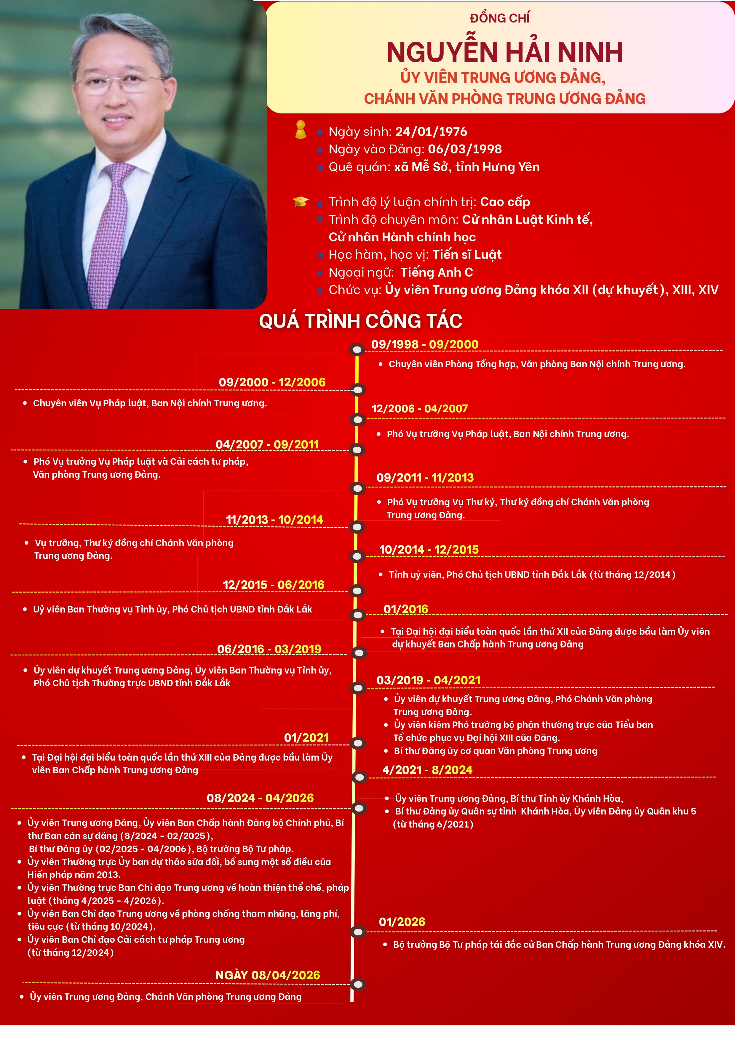 Sáng ngày 8/4, tại Trụ sở Trung ương Đảng, Bộ Chính trị đã trao quyết định điều động, phân công, bổ nhiệm đồng chí Nguyễn Hải Ninh, Ủy viên Ban Chấp hành Trung ương Đảng, Bộ trưởng Bộ Tư pháp giữ chức Chánh Văn phòng Trung ương Đảng. Báo Pháp luật Việt Nam trân trọng giới thiệu tóm tắt tiểu sử của đồng chí Nguyễn Hải Ninh, Chánh Văn phòng Trung ương Đảng.
