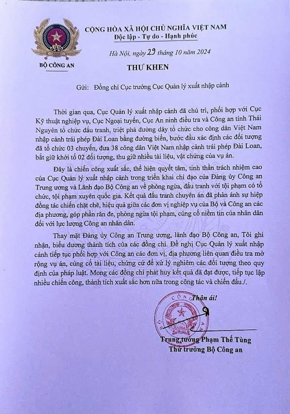Nội dung Thư khen nêu rõ: Thời gian qua, Cục Quản lý xuất nhập cảnh đã chủ trì, phối hợp với Cục Kỹ thuật nghiệp vụ, Cục Ngoại tuyến, Cục An ninh điều tra và Công an tỉnh Thái Nguyên tổ chức đấu tranh, triệt phá đường dây tổ chức cho công dân Việt Nam nhập cảnh trái phép Đài Loan (Trung Quốc) bằng đường biển, bước đầu xác định các đối tượng đã tổ chức 03 chuyến, đưa 38 công dân Việt Nam nhập cảnh trái phép Đài Loan (Trung Quốc), bắt giữ khởi tố 02 đối tượng, thu giữ nhiều tài liệu, vật chứng của vụ án.