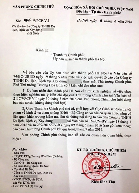 “Giao Thanh tra Chính phủ chủ trì, phối hợp với Cục Cảnh sát điều tra tội phạm về kinh tế và tham nhũng (C46 - Bộ Công an) và các cơ quan chức năng có liên quan khẩn trương kiểm tra, làm rõ nội dung tố cáo của Công ty TNHH B.Y., báo cáo Thủ tướng Chính phủ kết quả trong tháng 7/2016.” - công văn số 4865 ngày 16/6/2016 của Văn phòng Chính phủ truyền đạt ý kiến của Phó Thủ tướng Chính phủ Trương Hòa Bình.