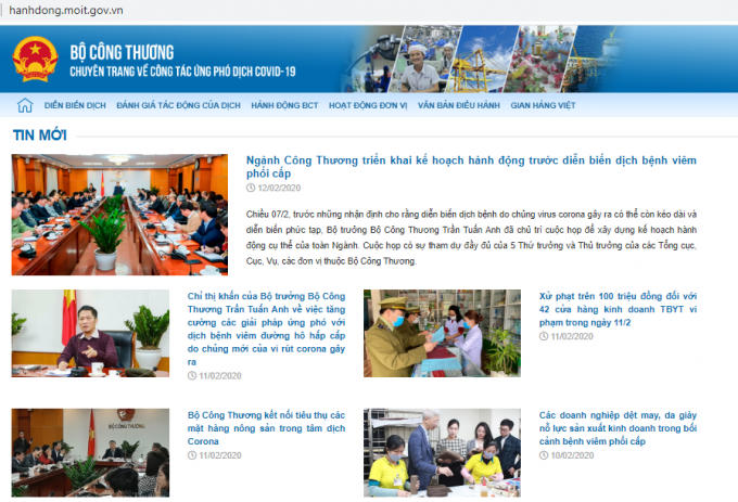 Theo Thông tin Bộ Công Thương, ngày 12/2/2020, Bộ Công Thương chính thức ra mắt chuyên trang phòng chống dịch bệnh Covid-19 tại địa chỉ: http://hanhdong.moit.gov.vn