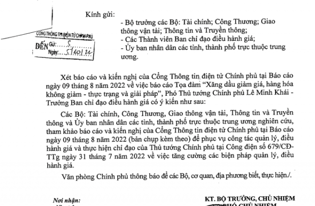 Theo báo cáo của các doanh nghiệp đầu mối, lượng tồn kho của một số doanh nghiệp đầu mối kinh doanh xăng dầu lớn vẫn đang được duy trì và bảo đảm cung ứng đủ nguồn hàng trong hệ thống như Petrolimex tồn kho đến ngày 8/10 là khoảng 489 nghìn m3 (gồm 208 nghìn m3 xăng và 280 nghìn m3 dầu); Pvoil còn khoảng 230 nghìn m3; Công ty xăng dầu Quân đội còn khoảng 19 nghìn m3; Saigon Petro còn khoảng 11 nghìn m3; Petimex Đồng Tháp còn khoảng 45 nghìn m3; Thanh Lễ còn khoảng 60 nghìn m3...