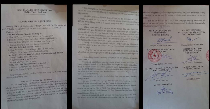 Trong biên bản này ghi rõ, lúc 4h ngày 27/4, Cục Cảnh sát môi trường phối hợp với Văn phòng cơ quan CSĐT và Bộ Tư lệnh CSCĐ bắt quả tang các đối tượng đang vận chuyển trái phép lâm sản (gỗ) trên hai xe ô tô mang biển số: 61C-07.270 và 61L-3057 tại khu vực thị trấn Ea T’Linh, huyện Cư Jút.