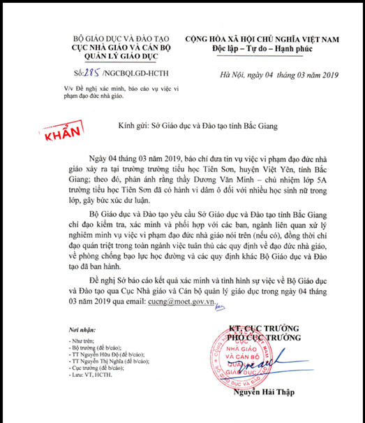 Cụ thể, Văn bản chỉ đạo nêu “Ngày 04 tháng 03 năm 2019, báo chí đưa tin vụ việc vi phạm đạo đức nhà giáo xảy ra tại trường tiểu học Tiên Sơn, huyện Việt Yên, tỉnh Bắc Giang, nội dung phản ánh rằng thầy Dương Văn Minh chủ nhiệm lớp 5A trường tiểu học Tiên Sơn đã có hành vi dâm ô đối với nhiều học sinh nữ trong lớp, gây bức xúc dư luận”.