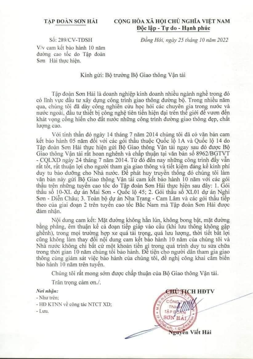 Văn bản do ông Nguyễn Viết Hải - Chủ tịch HĐTV Tập đoàn Sơn Hải ký, cam kết bảo hành 10 năm với các gói thầu trên những tuyến cao tốc do Tập đoàn này thực hiện, gồm: Gói thầu số 10-XL dự án Mai Sơn - Quốc lộ 45; Gói thầu số XL01 dự án Nghi Sơn - Diễn Châu; Toàn bộ dự án Nha Trang - Cam Lâm và các gói thầu tiếp theo của cao tốc Bắc - Nam phía Đông giai đoạn 2 mà Tập đoàn Sơn Hải được đảm nhận.