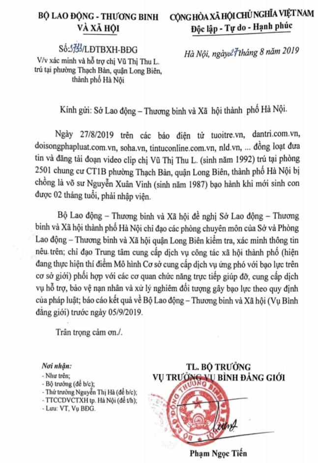 Ngay sau khi nội dung bài viết được đăng tải, mới đây ngày 27/8/2019 ông Phạm Ngọc Tiến - Vụ trưởng Vụ Bình đẳng giới đã thừa lệnh Bộ trưởng Bộ Lao động – Thương binh và Xã hội (Bộ LĐTB&XH) đã ký, ban hành văn bản số 3733 về việc xác xác minh và hỗ trợ chị Vũ Thị Thu L. trú tại phường Thạch Bàn (quận Long Biên, Hà Nội).