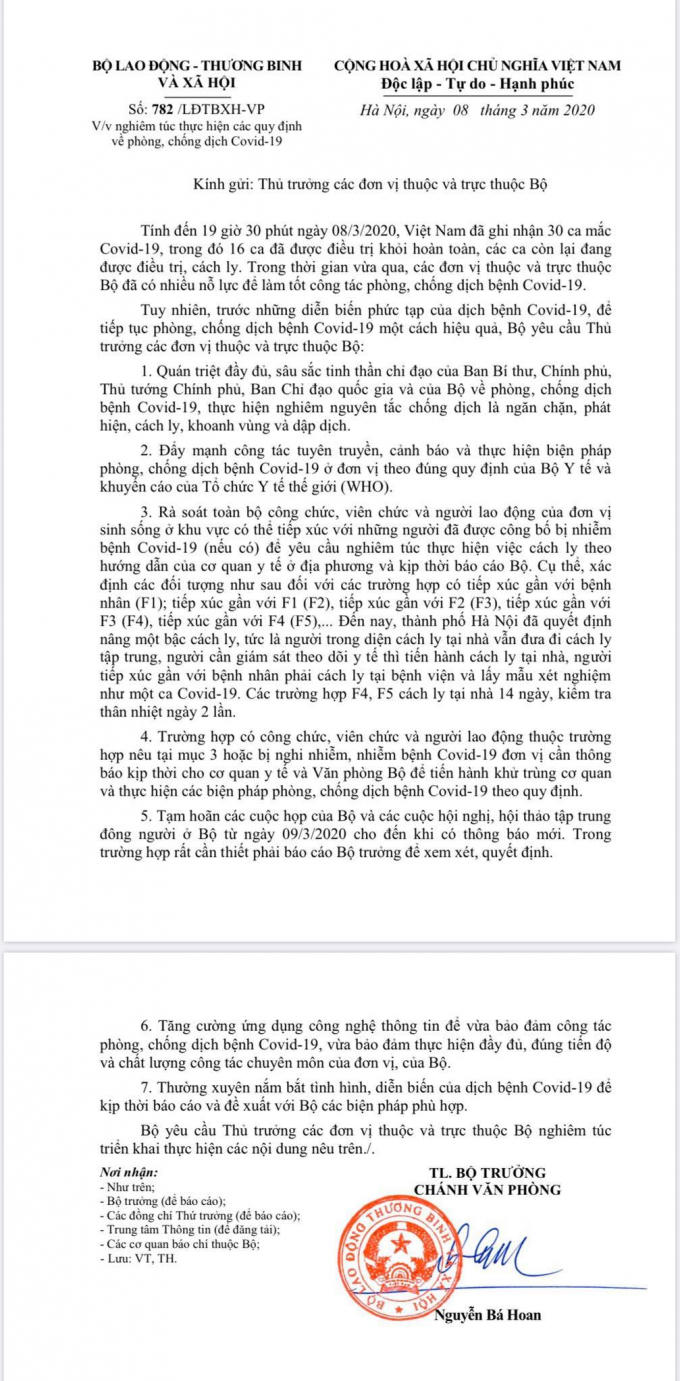 Ngoài ra, Bộ LĐTH&XH yêu cầu rà soát toàn bộ công chức, viên chức và người lao động của đơn vị sinh sống ở khu vực có thể tiếp xúc với những người đã được công bố bị nhiễm bệnh Covid-19 (nếu có) để yêu cầu nghiêm túc thực hiện việc cách ly theo hướng dẫn của cơ quan y tế ở địa phương và kịp thời báo cáo Bộ.