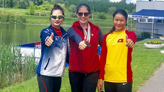 Huấn luyện viên thể thao Dương Thị Mai (giữa) và các vận động viên.