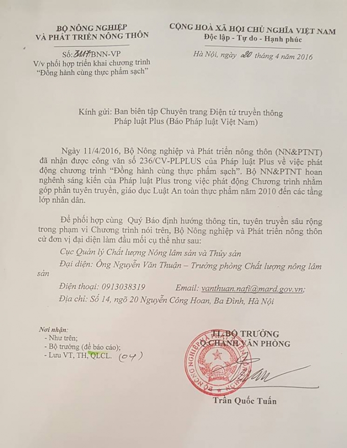 Bộ Nông nghiệp & Phát triển nông thôn chính thức phối hợp với Pháp luật Plus về việc triển khai chương trình “Đồng hành cùng Thực phẩm sạch”.