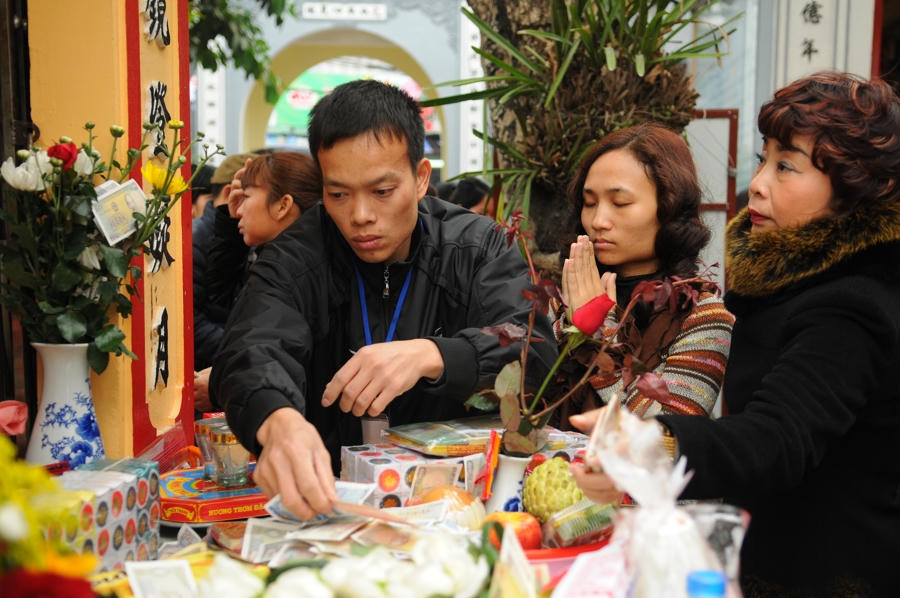 Người dân thả tiền công đức tại Phủ Tây Hồ, Hà Nội. Ảnh: Phạm Hùng