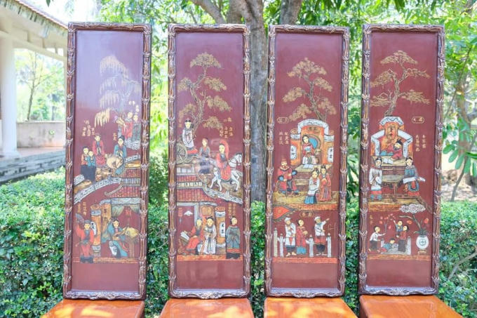 Theo đó, bộ tranh được làm bằng chất liệu sơn mài, khảm vỏ trứng thếp vàng, gồm 4 bức tranh, mỗi bức có trọng lượng hơn 2kg, chiều rộng 35cm, chiều cao 1,2m, xung quanh viền của mỗi bức tranh được làm nổi theo biểu tượng cây tre truyền thống.