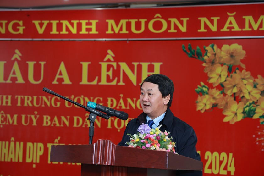 Bộ trưởng, Chủ nhiệm Ủy ban Dân tộc Hầu A Lềnh phát biểu tại buổi thăm hỏi.