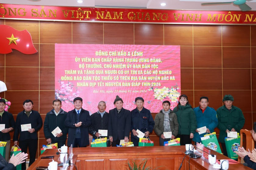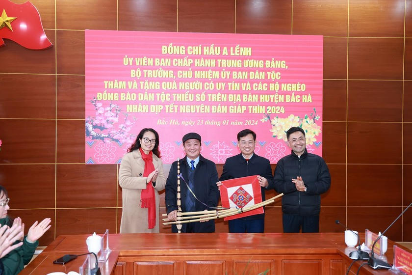 Cũng trong ngày 23/01/2024, Bộ trưởng Hầu A Lềnh cùng đoàn công tác đã thăm hỏi, tặng quà người có uy tín và các hộ nghèo người đồng bào dân tộc thiểu số trên địa bàn huyện Bắc Hà (Lào Cai).