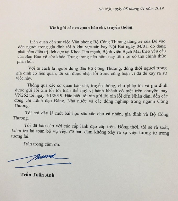 Bộ trưởng Trần Tuấn Anh gửi thư xin lỗi đến nhân dân, các đồng chí lãnh đạo Đảng, Nhà nước và các đồng nghiệp trong ngành Công Thương về việc sử dụng xe của bộ vào đón người nhà ở khu vực sân bay Nội Bài ngày 4/1 vừa qua.