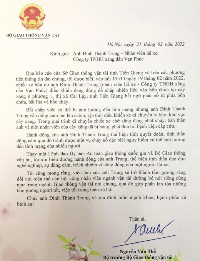 Bộ trưởng Bộ Giao thông vận tải Nguyễn Văn Thể vừa gửi thư khen lái xe Đinh Thành Trung đã dũng cảm lái xe bồn đang bốc cháy ra khỏi cây xăng ở Tiền Giang.