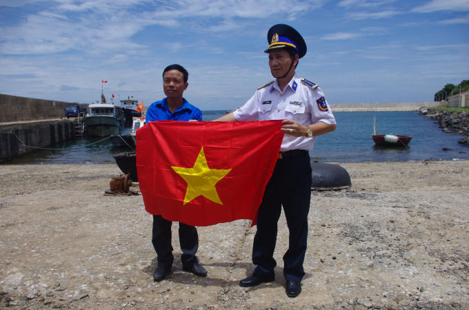 Đại tá Lê Huy Sinh, Chính ủy Bộ Tư lệnh vùng Cảnh sát Biển 2 tặng cờ Tổ quốc cho ngư dân.