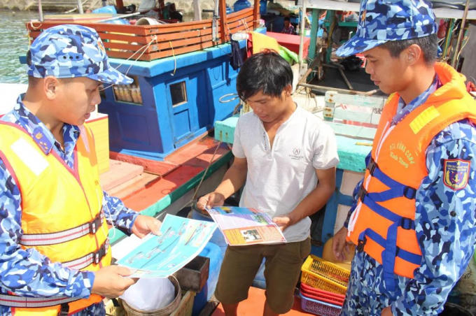 Phát tờ rơi, tuyên truyền cho ngư dân trên tàu cá.