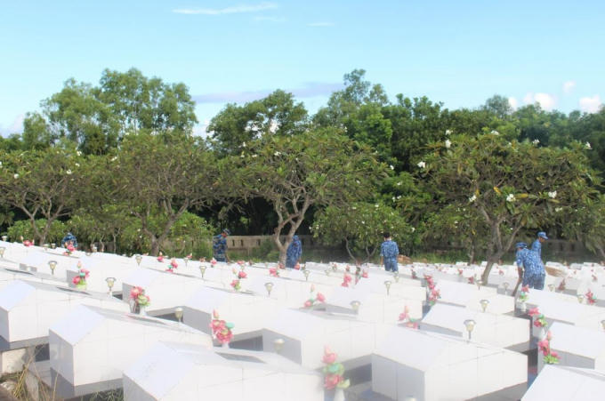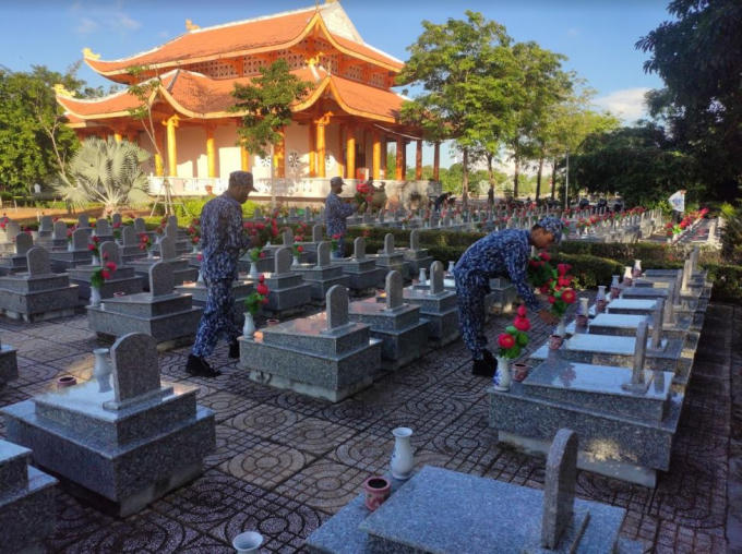 Cán bộ, chiến sĩ BTL Vùng Cảnh sát biển 4 tham gia vệ sinh khuôn viên Nghĩa trang Liệt sĩ Phú Quốc.