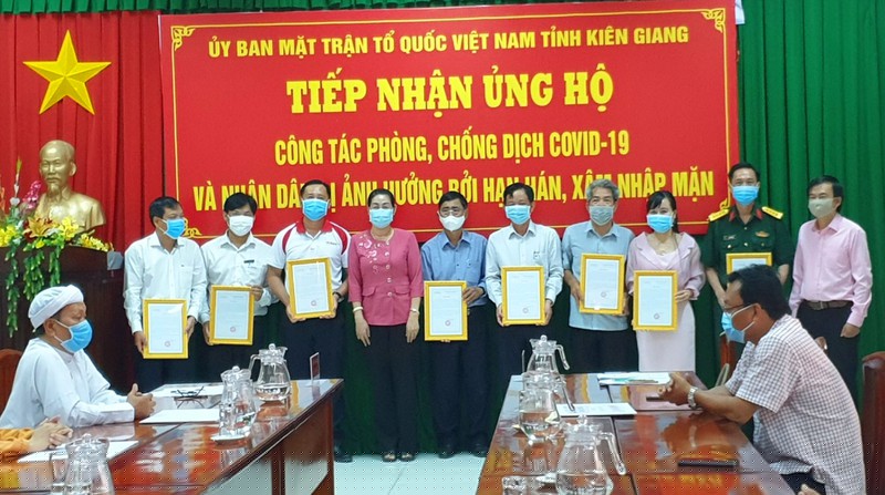 Theo đó, từ ngày 31/03/2020, các cấp trong tỉnh đã kêu gọi sự chung tay, giúp đỡ của các cá nhân, tổ chức trong và ngoài tỉnh cùng nhau chia sẻ khó khăn hỗ trợ nguồn nhân lực và vật lực phục vụ cho công tác phòng, chống dịch Covid-19 và đồng bào bị thiệt hại do hạn mặn trên địa bàn.Tại buổi lễ, ông Ngô Phương Vũ - Phó Chủ tịch Ủy ban MTTQ Việt Nam tỉnh, Phó Trưởng Ban cứu trợ cấp tỉnh Kiên Giang, cũng thông qua báo cáo tình hình ủng hộ công tác phòng, chống Covid-19 và giúp nhân dân bị ảnh hưởng do hạn hán, xâm nhập mặn.
