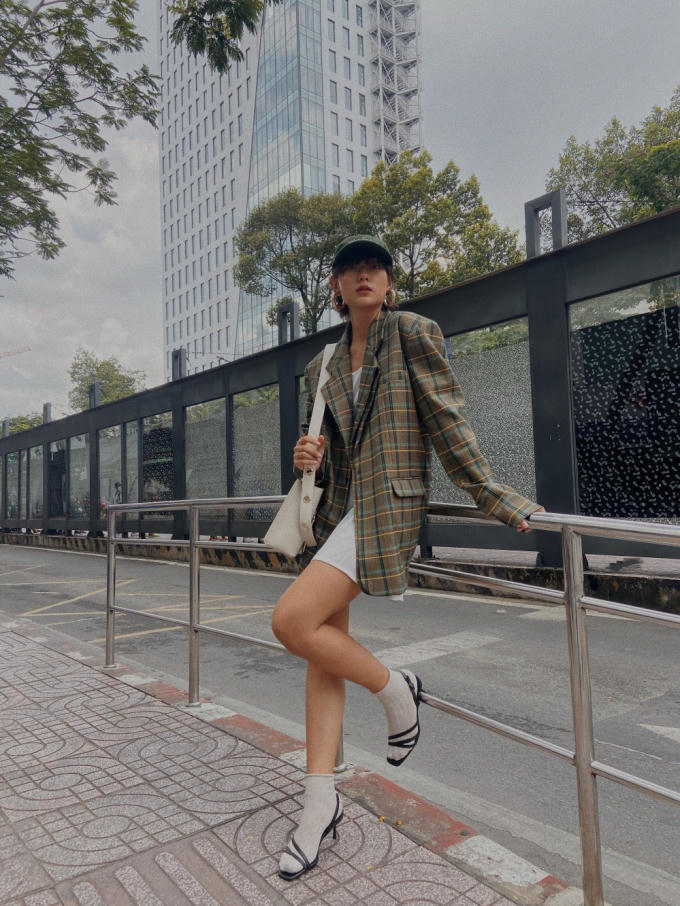 Với tone màu xanh rêu nhã nhặn, cô nàng đã mix and match chiếc áo blazer của mình cùng với chiếc đầm trắng mang đến một nét hiện đại. Nhấn nhá vào đó là cách phối giày sandal đi cùng vớ, một chiếc nón kết và chiếc túi đeo vai bản to tạo ra tổng thể cực kỳ “high - fashion”.