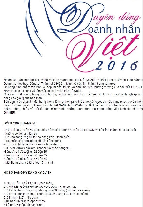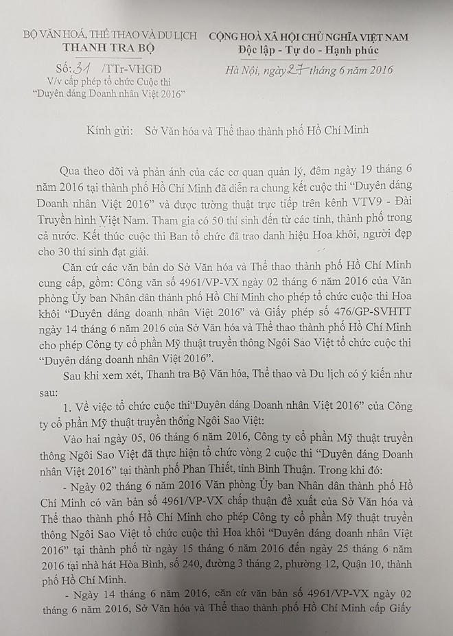 Ngày 27/6, ông Vũ Xuân Thành - Chánh Thanh tra Bộ Văn hóa Thể thao Du lịch đã có công văn gửi Sở Văn hóa Thể thao TP HCM yêu cầu giải trình về cuộc thi Duyên dáng Doanh nhân Việt 2016, được tổ chức vào tối 19/6 tại Nhà hát Hòa Bình (TP HCM) và truyền hình trực tiếp trên kênh VTV9.