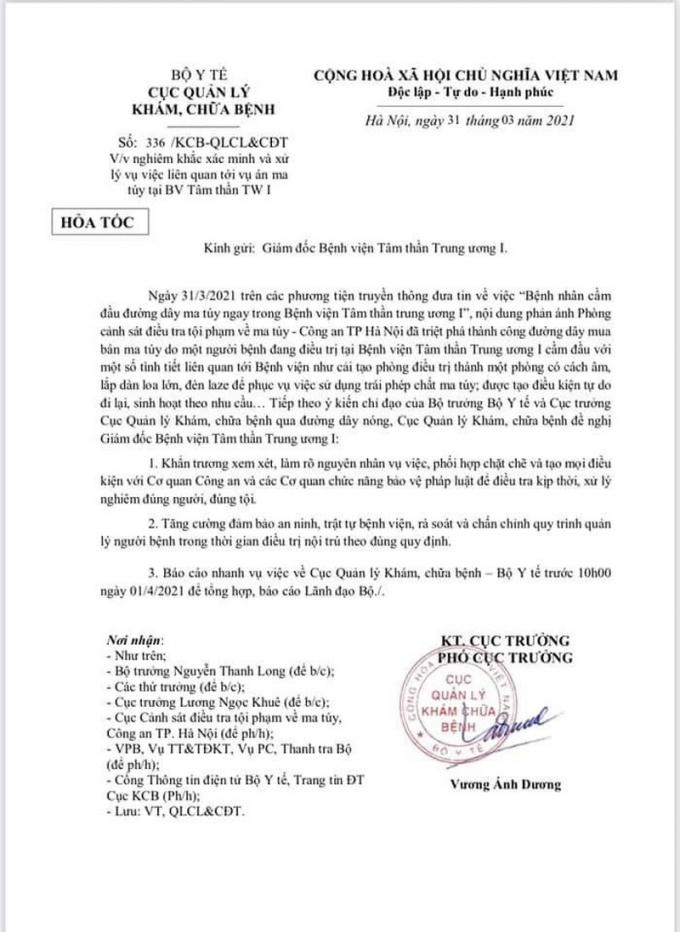 Theo công văn hỏa tốc do phó cục trưởng Cục quản lý Khám chữa bệnh Vương Ánh Dương ký, ngày 31/3 trên các phương tiện truyền thông đưa tin về vụ việc "Bệnh nhân cầm đầu đường dây ma túy trong Bệnh viện Tâm thần Trung ương 1", nội dung phản ánh Phòng cảnh sát điều tra tội phạm về ma túy - Công an Hà Nội triệt phá thành công đường dây mua bán ma túy do một người bệnh đang điều trị tại Bệnh viện Tâm thần Trung ương I cầm đầu.