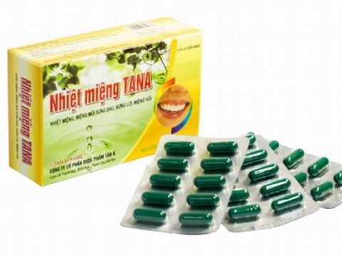 Sản phẩm Viên nang Nhiệt miệng TANA được quảng cáo có tác dụng điều trị các trường hợp bị nhiệt miệng, bệnh nhiệt miệng, miệng môi sưng đau, sưng lợi, đau nhức răng, viêm họng, hơi thở có mùi... Thuốc này được chỉ định dùng với liều lượng cho trẻ em dưới 12 tuổi uống 2 viên/lần và dùng 3 lần/ngày sau khi ăn. Chống chỉ định với phụ nữ có thai, người dương hư thể hàn, tỷ vị hư hàn