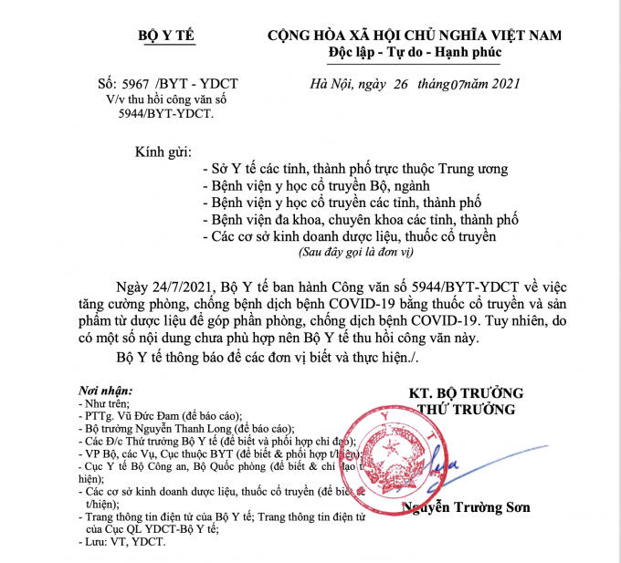 Sáng 26/7, Bộ Y tế đã thu hồi Công văn Số: 5944/BYT-YDCT liên quan danh sách "12 loại thuốc Đông y điều trị Covid-19".