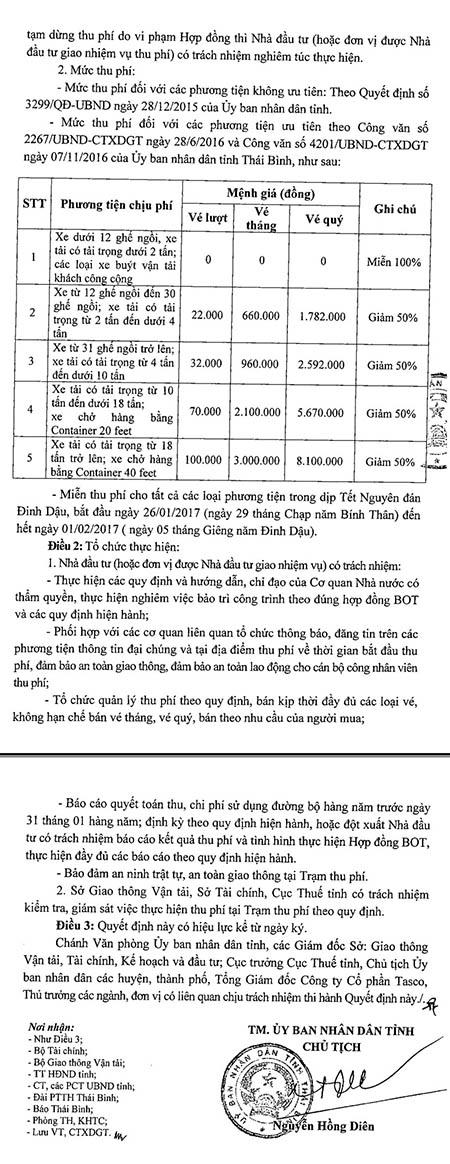 Trong quyết định này có điểm nêu rõ, miễn thu phí 100% đối với xe dưới 12 ghế ngồi, xe tải có trọng lượng dưới 2 tấn và các loại xe buýt vận tải khách công cộng (áp dụng với phương tiện của người dân và doanh nghiệp đóng trên địa bàn hai huyện Tiền Hải, Kiến Xương).