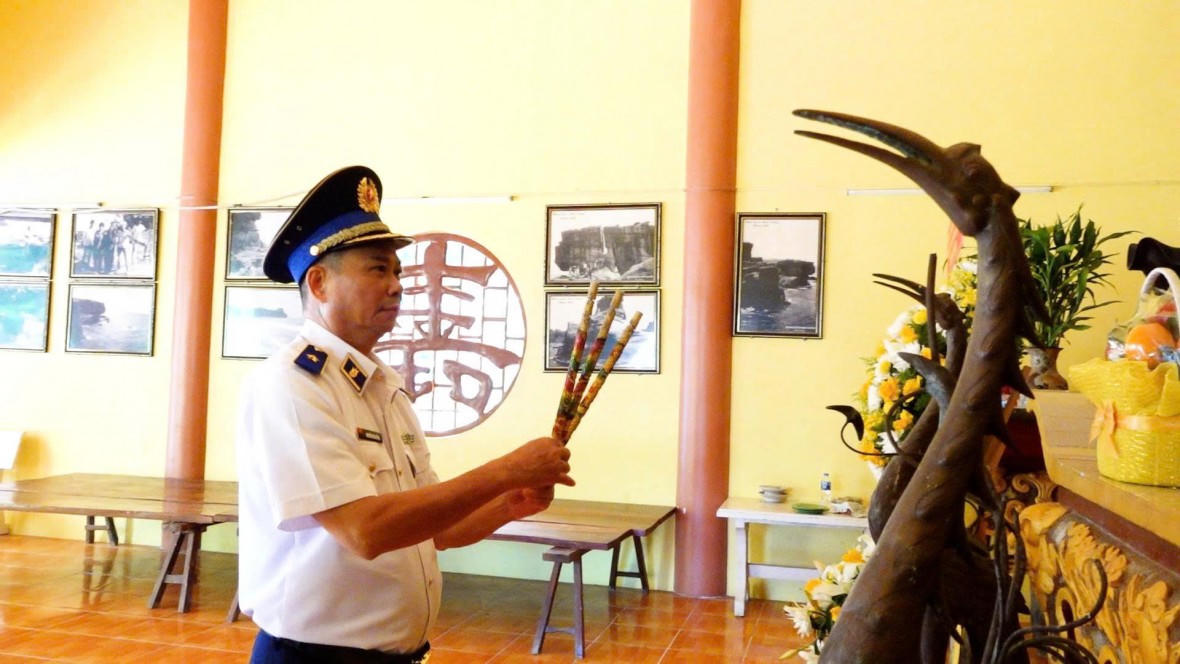 Ngay sau khi đặt chân đến Thổ Chu, Đoàn công tác đã tổ chức viếng, dâng hương, dâng hoa tại Đền thờ Thổ Châu - nơi tưởng niệm Chủ tịch Hồ Chí Minh và những anh hùng liệt sỹ đã anh dũng hy sinh trong sự nghiệp bảo vệ chủ quyền biển, đảo thiêng liêng của Tổ quốc cùng hơn 500 đồng bào vô tội bị Pol Pot sát hại vào tháng 5/1975.