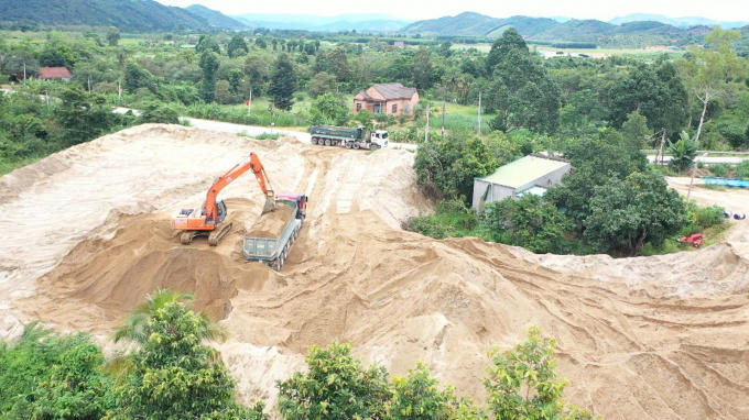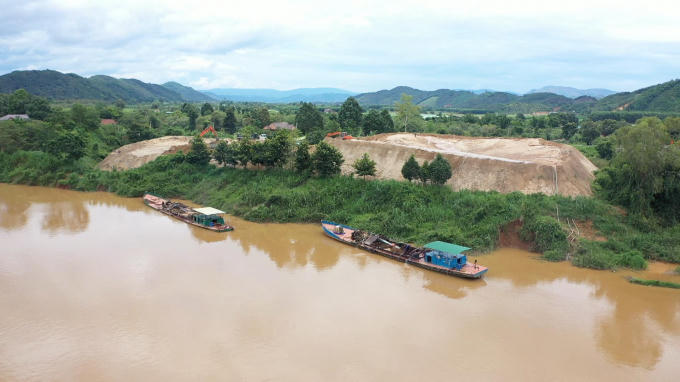 Dưới sông, các vòi bơm cát lên một bãi cũng ồ ạt phun, như chạy đua với cần cạp xe cuốc. Một nhóm công nhân chạy ngược xuôi, dáng vẻ hối hả. Nhìn từ trên cao, họ nhỏ bé như con kiến bò trong chậu. Bãi cát khổng lồ như một sân bóng, cao vợi nếu nhìn từ mặt sông. Được biết, đây là bãi cát của Doanh nghiệp tư nhân Xuân Hà. Một số người dân nơi đây thông tin, doanh nghiệp này hút cát từ năm 2009. Đến nay, họ đã khai thác khoáng sản ở đây ngoài 10 năm và hiện vẫn chưa dừng lại.