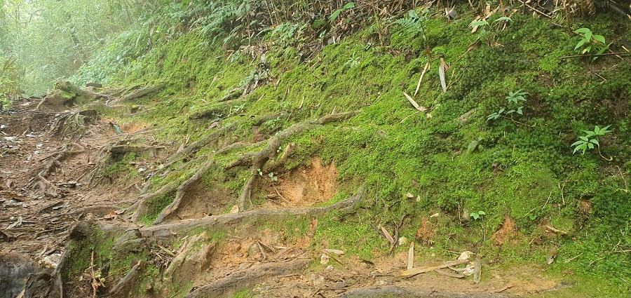 Thiên nhiên cũng khéo xếp đặt. Cứ sau một cung đường hiểm trở dốc đá, lại là mướt mát những màu xanh. Có đoạn dốc dựng đứng, đầu người đi sau chạm gót giày người đi trước. Có đoạn một bên là vách núi, một bên là thăm thẳm vực sâu, lúc lại là đoạn để lữ khách thong dong như đi tản bộ với tiếng róc rách của suối, tiếng reo của lá, tiếng vi vút của gió, của lá rừng đại ngàn. Có đoạn đi dưới rừng già tán rộng, đoạn lại len lỏi trong rừng trúc thân nhỏ. Có khi là cung đường căng thẳng đến nghẹt thở, đá nhọn gập ghềnh, lúc lại như được bước chân trên thềm lâu đài cổ tích phủ đầy rêu, êm mượt như nhung…
