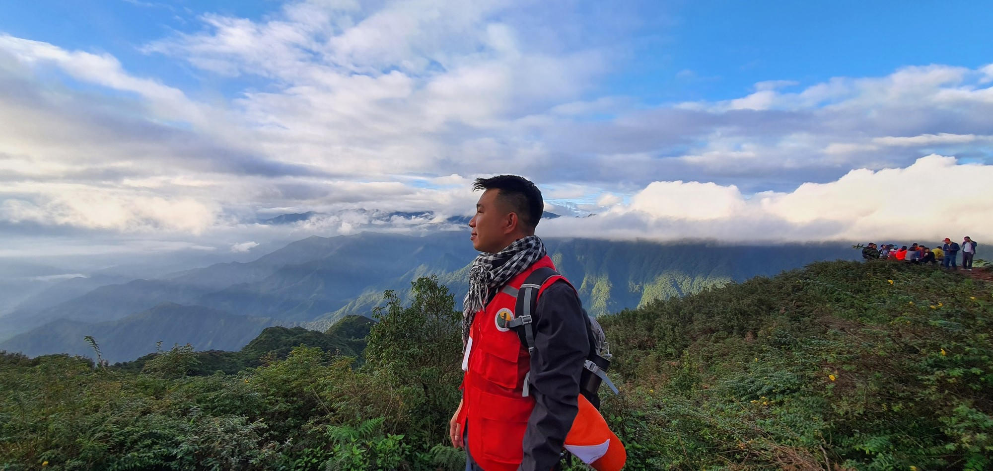 "Bóng áo đỏ của đồng nghiệp mình lẫn trong màu lá xanh, trong cung đường vắt vẻo phía trước"