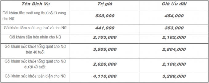 Giảm giá 20% các gói khám dành cho nữ. Thời gian áp dụng chương trình từ ngày 01/03/2016 đến ngày 31/03/2016. Cụ thể: