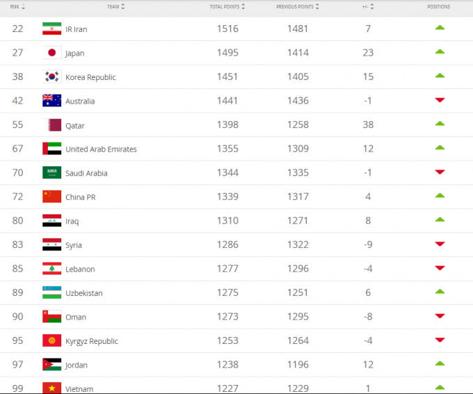 Thăng tiến mạnh mẽ nhất không phải cái tên nào khác ngoài Qatar, tân vương châu Á. Đoàn quân của HLV Felix Sanchez Bas kiếm được tới 140 điểm và nhảy vọt 38 bậc trên BXH, lên thứ 55 và đây cũng là vị trí cao nhất trong lịch sử đội bóng Tây Á này.