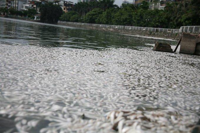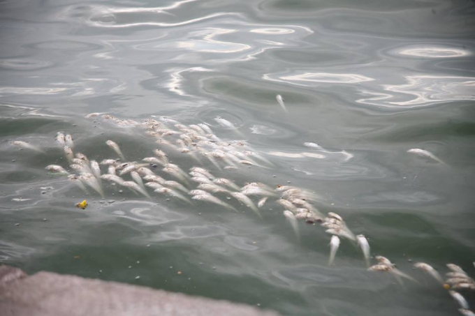 Do thay đổi thời tiết đột ngột, cá chết nổi trắng mặt Hồ Tây.