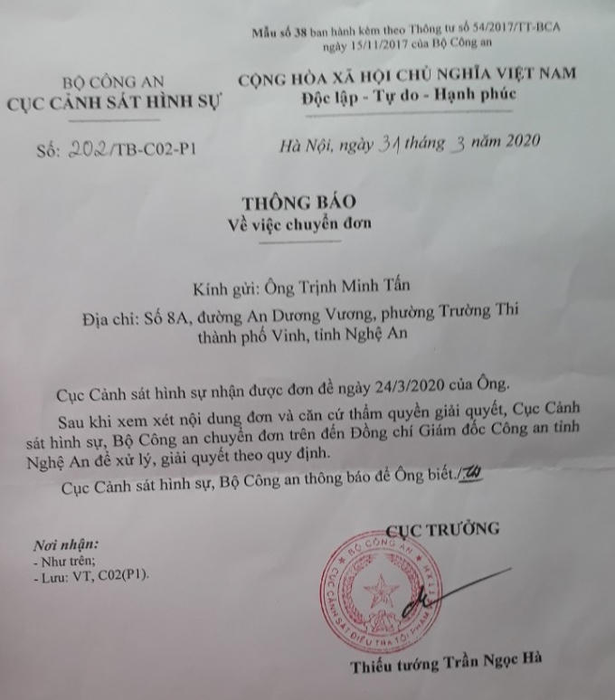 Trao đổi với phóng viên, ông Trịnh Minh Tấn (SN 1959, trú tại phường Trường Thi, TP Vinh, Nghệ An) người suốt nhiều tháng qua đã “đội đơn” cầu cứu khắp nơi vì lo lắng cho an toàn tính mạng của bản thân mình và gia đình cho biết, ông vừa nhận được thông báo, kết quả giải quyết đơn tố giác tội phạm và quyết định không khởi tố vụ án hình sự từ Cơ quan cảnh sát điều tra Công an TP Vinh, Nghệ An.