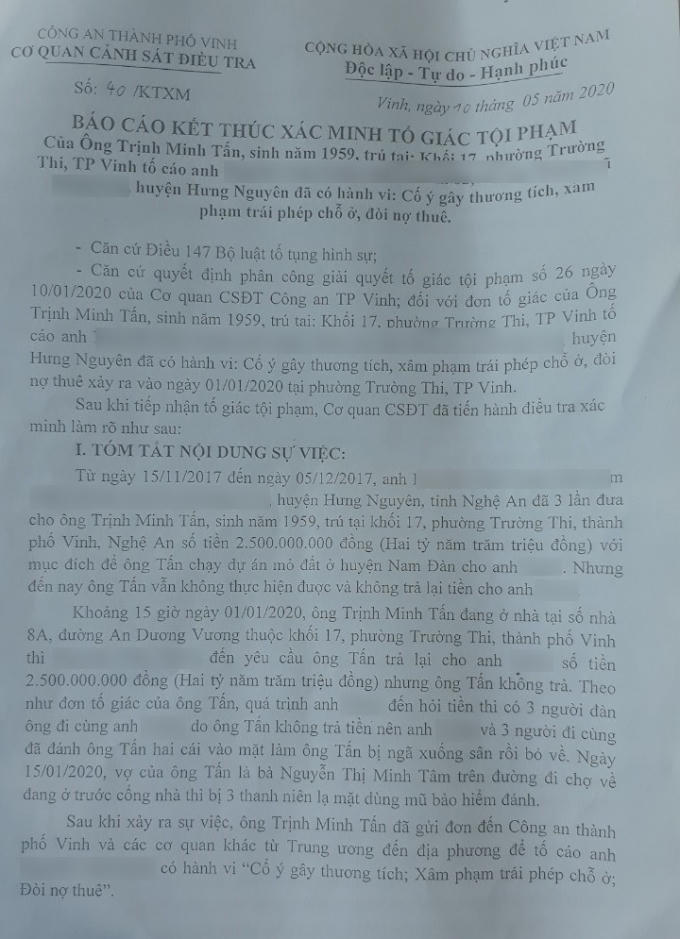 Cụ thể trong báo cáo kết thúc xác minh tố giác tội phạm, công an TP Vinh lý giải, quá trình giải quyết vụ việc, ngày 16/1/2020 Cơ quan cảnh sát điều tra đã trưng cầu giám định thương tích đối với ông Tấn và vợ là bà Nguyễn Thị Minh Tâm, kết quả cho thấy tỷ lệ tổn thương cơ thể của ông Tấn và vợ đều là 0 %. Thứ 2, việc ông Tấn nhận tiền của anh Ng.V.U là thực tế, lý do nhận tiền là để chạy dự án mỏ đất cho anh U nhưng không thực hiện được, ông Tấn cũng không trả lại tiền. Kết quả giám định trong các giấy giao nhận tiền đúng là chữ ký của ông Tấn.