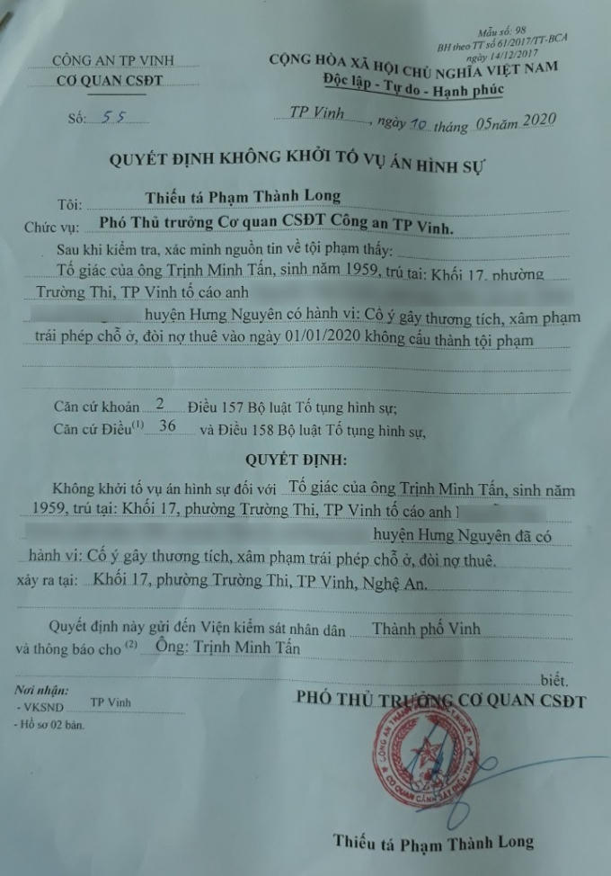Theo đó, tại “Quyết định không khởi tố vụ án hình sự” nêu rõ: “Sau khi kiểm tra xác minh nguồn tin về tội phạm nhận thấy, tố giác của ông Trịnh Minh Tấn tố cáo anh Ng.V.U (SN 1982, trú tại huyện Hưng Nguyên) có hành vi: Cố ý gây thương tích, xâm phạm trái phép chỗ ở, đòi nợ thuê… không cấu thành tội phạm”.