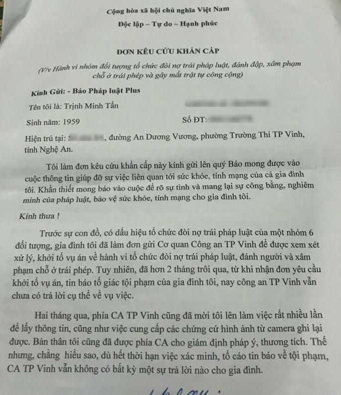 Ngay sau khi sự việc xảy ra, lo ngại cho tính mạng của mình và người thân ông Tấn đã lập tức làm Đơn trình báo sự việc đến Công an phường Trường Thi, TP Vinh, mong muốn cơ quan điều tra nhanh chóng vào cuộc xử lý nghiêm các đối tượng, đảm bảo an toàn, tính mạng cho những người gia đình ông.