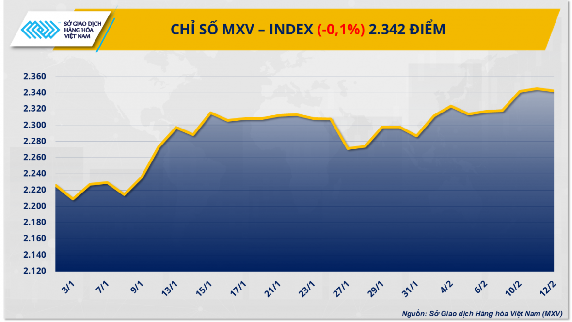 Theo Sở Giao dịch hàng hóa Việt Nam (MXV), thị trường hàng hóa nguyên liệu thế giới diễn biến giằng co trong phiên giao dịch ngày hôm qua, 12/2. Đặc biệt, trên thị trường nguyên liệu công nghiệp, giá hai mặt hàng cà phê đồng loạt quay đầu tăng mạnh trước những lo ngại về nguồn cung. Trong khi đó, ở chiều ngược lại, giá hai mặt hàng dầu thô chịu sức ép sau báo cáo của EIA. Đóng cửa, chỉ số MXV-Index giảm 0,1% về mức 2.342 điểm, chấm dứt chuỗi 4 phiên tăng liên tiếp.