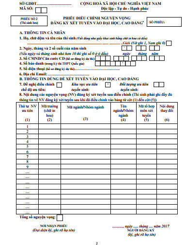 Nếu không thay đổi thứ tự nguyện vọng ưu tiên và các nội dung đã đăng ký thì thí sinh ghi số 0 tại cột (6) cùng hàng. Nếu chỉ thay đổi thứ tự nguyện vọng ưu tiên và giữ nguyên các nội dung khác đã đăng ký thì thí sinh ghi số thứ tự nguyện vọng ưu tiên cũ tại cột (6) cùng hàng.