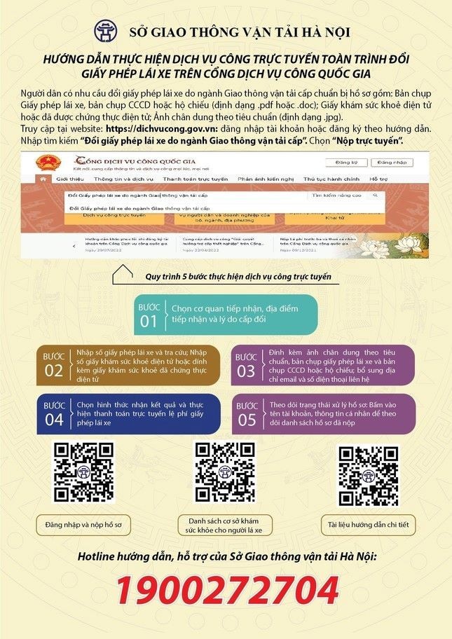 Cụ thể, Sở Giao thông vận tải Hà Nội cho biết, người dân có nhu cầu đổi bằng lái xe có thể thực hiện cấp, đổi trên cổng dịch vụ công Quốc gia và không phải đi lại.